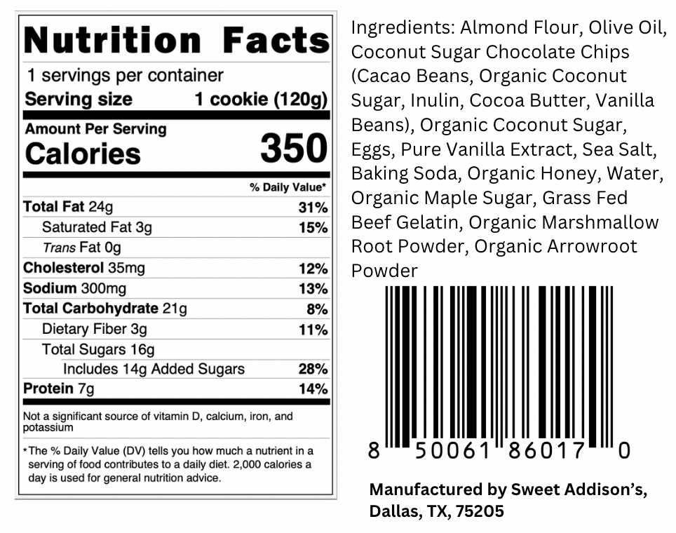 Almond Flour, Olive Oil, Coconut Sugar Chocolate Chips (Cacao Beans, Organic Coconut Sugar, Inulin, Cocoa Butter, Vanilla Beans), Organic Coconut Sugar, Eggs, Pure Vanilla Extract, Sea Salt, Baking Soda, Organic Honey, Water, Organic Maple Sugar, Grass Fed Beef Gelatin, Organic Marshmallow Root Powder, Organic Arrowroot Powder *Not produced in a dedicated gluten-free facility. Contains nuts and may contain traces of peanuts.